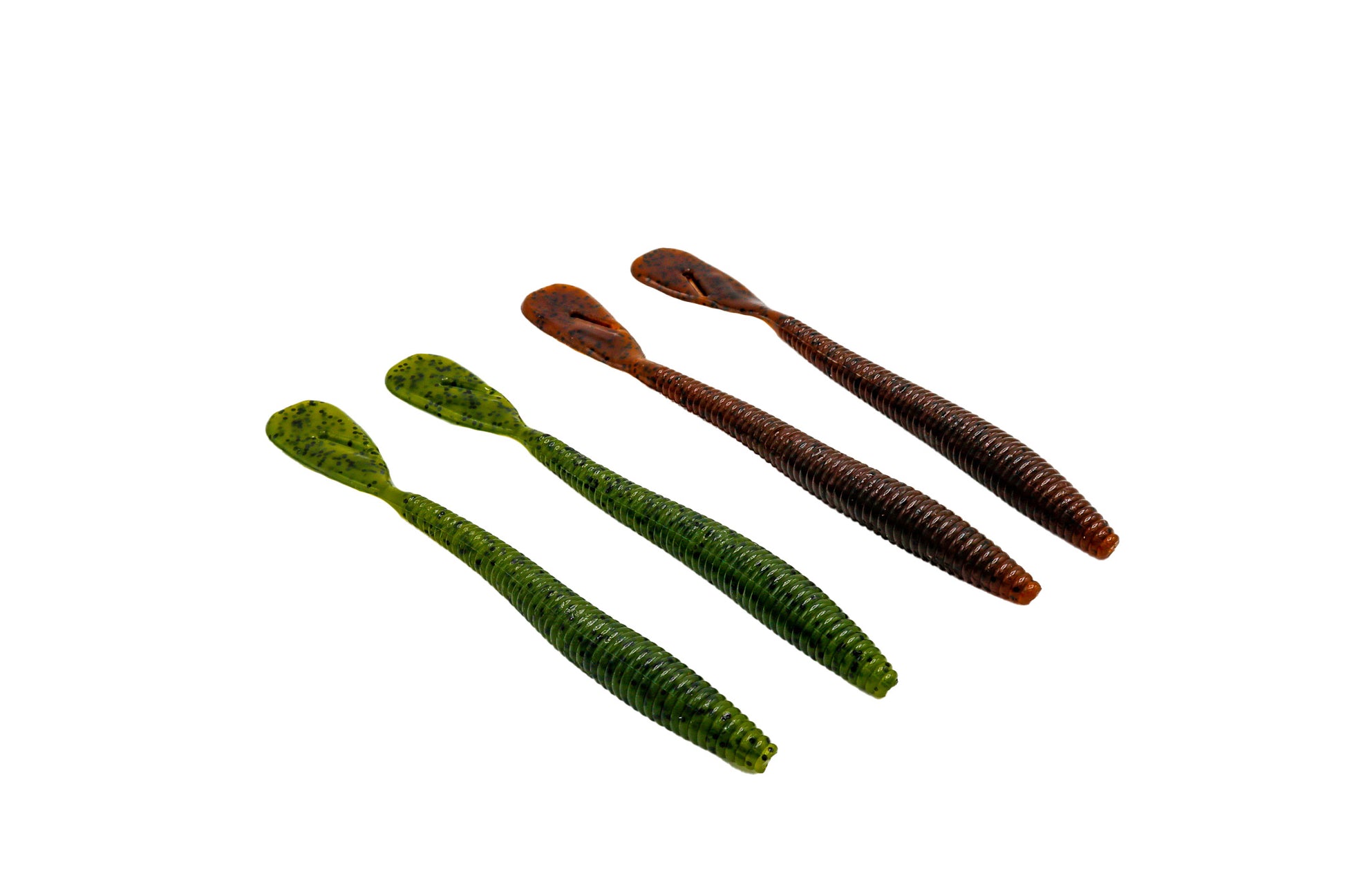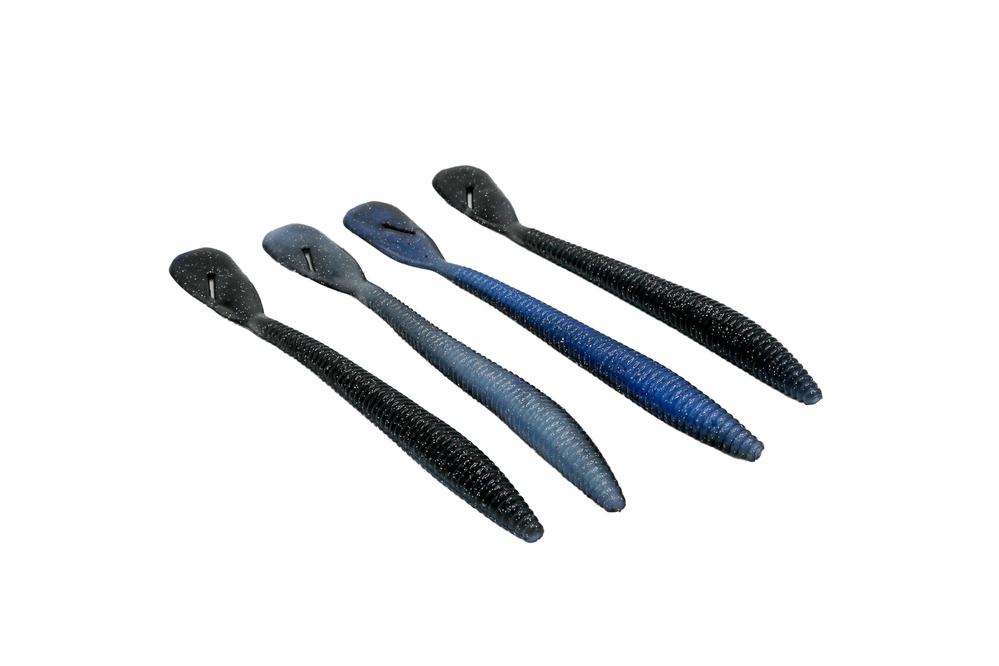 The Disco Worm is available in several color changing styles. Some styles are laminated baits whereby one half changes from one color to another, and the other half also changes from one color to another such as Smoke to Black and Pearl to Blue. The other style changes from one color to another such as Chartreuse to Red.